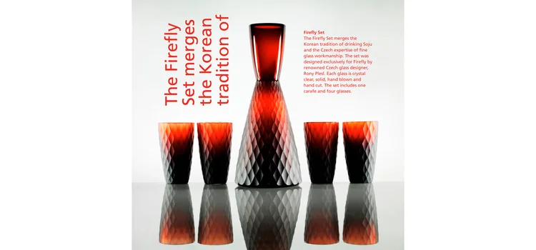 The Firefly Set merges the Korean tradition of drinking Soju with the Czech expertise of fine glass craftsmanship. The set was designed based in Geri Taper’s ‘Red and Blue” paintings, exclusively for Firefly and Jiwon Shin by renowned Czech glass designer, Rony Plesl. Each glass is hand blown and hand cut.